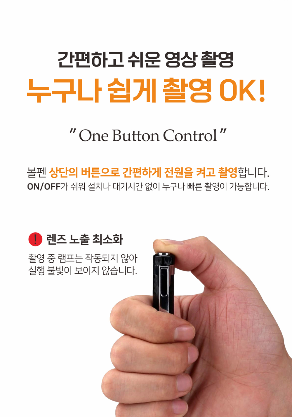 아주 간단한 온/오프 기능 조작으로 촬영모드로 전환되어 녹화를 시작할 수 있고 정지시킬 수 있습니다.