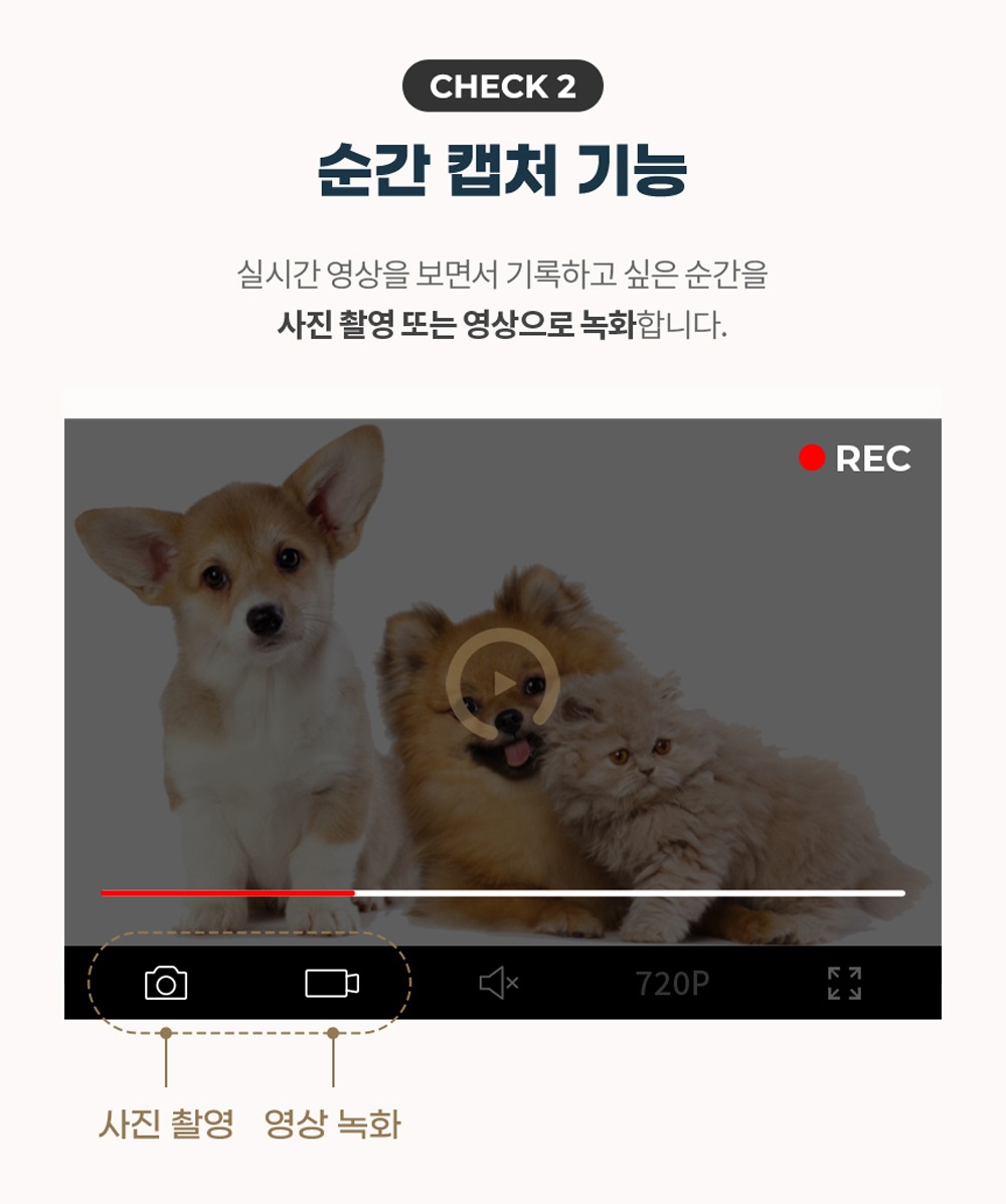 이 장치는 동작 감지 기능을 갖추고 있어, 집을 비우거나 반려동물을 혼자 두었을 때 유용합니다.