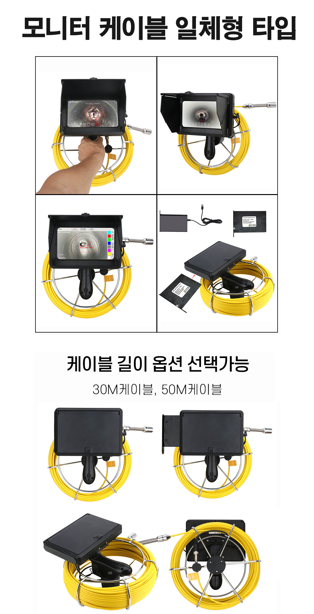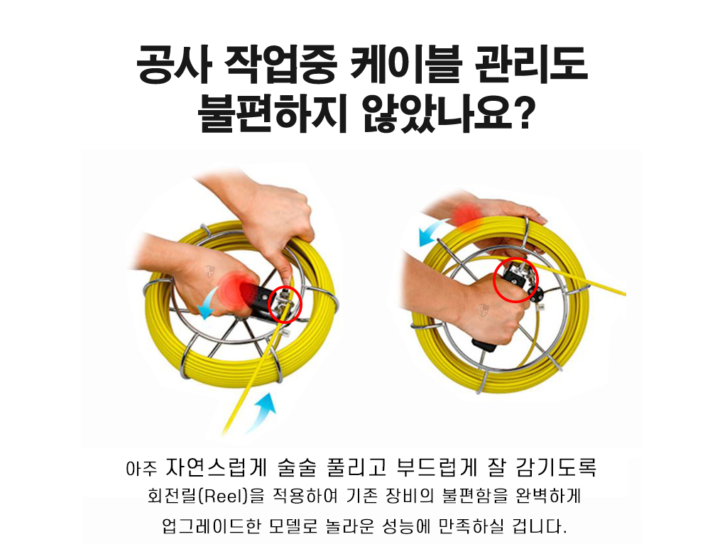 배관 점검 작업 중 케이블이 엉키는 문제는 작업을 지연시키는 주요 원인 중 하나인데, 이 제품은 이를 효과적으로 개선했습니다. 30m와 50m의 케이블 길이 옵션이 제공되어 현장의 상황에 맞게 작업을 수행할 수 있습니다.