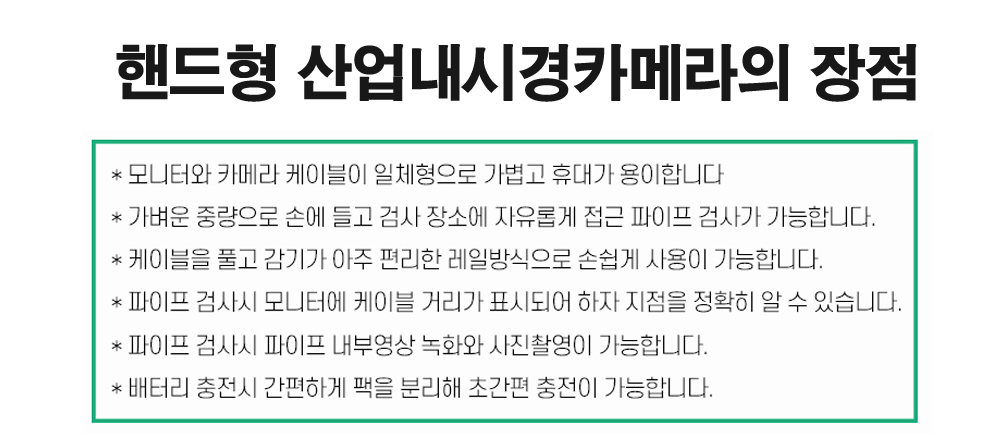 다양한 산업 현장에서 배관 점검, 하수관 점검, 자동차 정비, 설비 검사 등으로 활용할 수 있으며, 작업자의 편리함을 극대화한 제품으로 주목받고 있습니다.