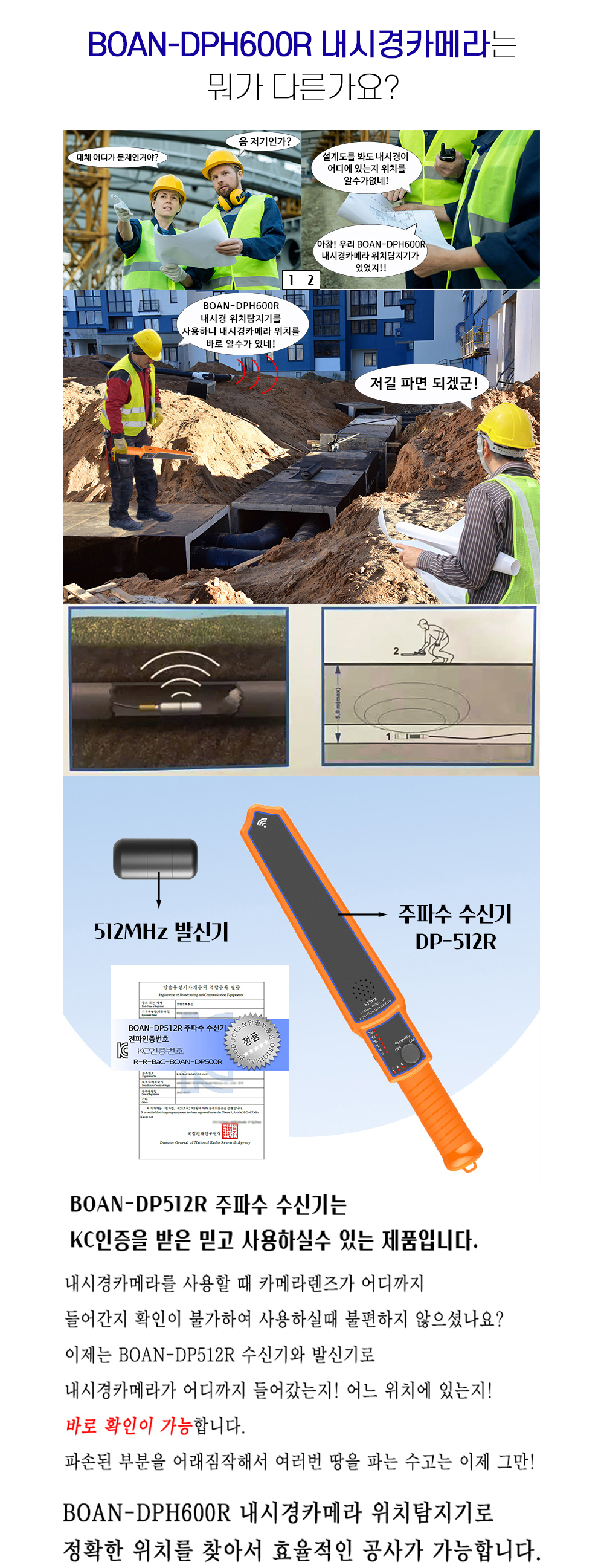 카메라의 위치를 실시간으로 확인할수 있고, 문제지점을 명확히 파악할 수 있기 때문에 불필요한 작업을 줄일 수 있습니다. 단순한 내시경 카메라와 달리 GPS와 카메라 위치 탐지 기능이 추가되어 작업 과정이 훨씬 더 스마트하고 효율적입니다.