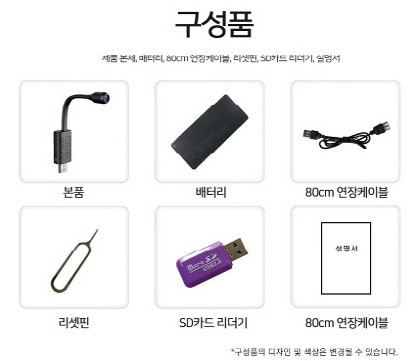 구성품으로는 본체, 충전용 배터리, 80cm 연장 케이블, 리셋핀, SD카드 리더기, 한글설명서가 포함됩니다.