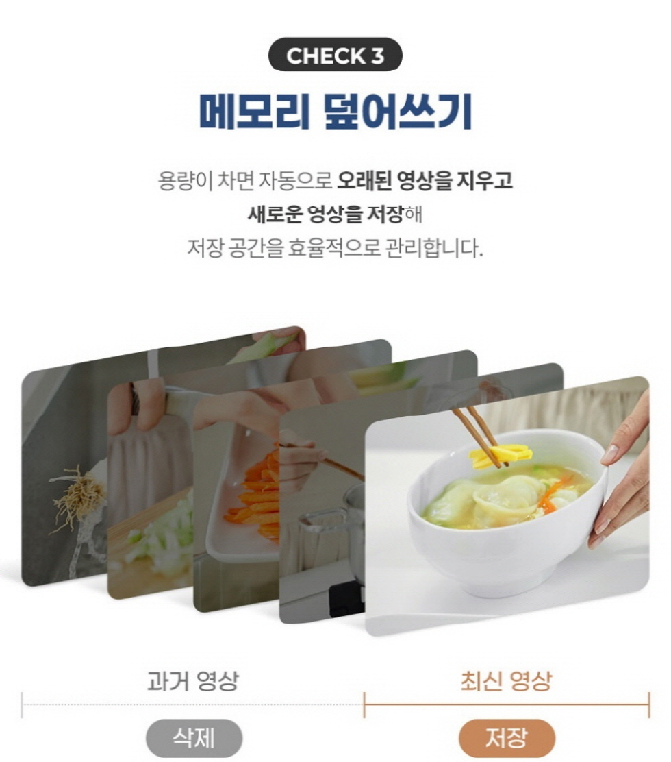 저장 공간이 가득 차면 오래된 영상을 자동 삭제하고 새로운 영상을 저장하는 기능으로 지속적인 사용이 가능합니다.