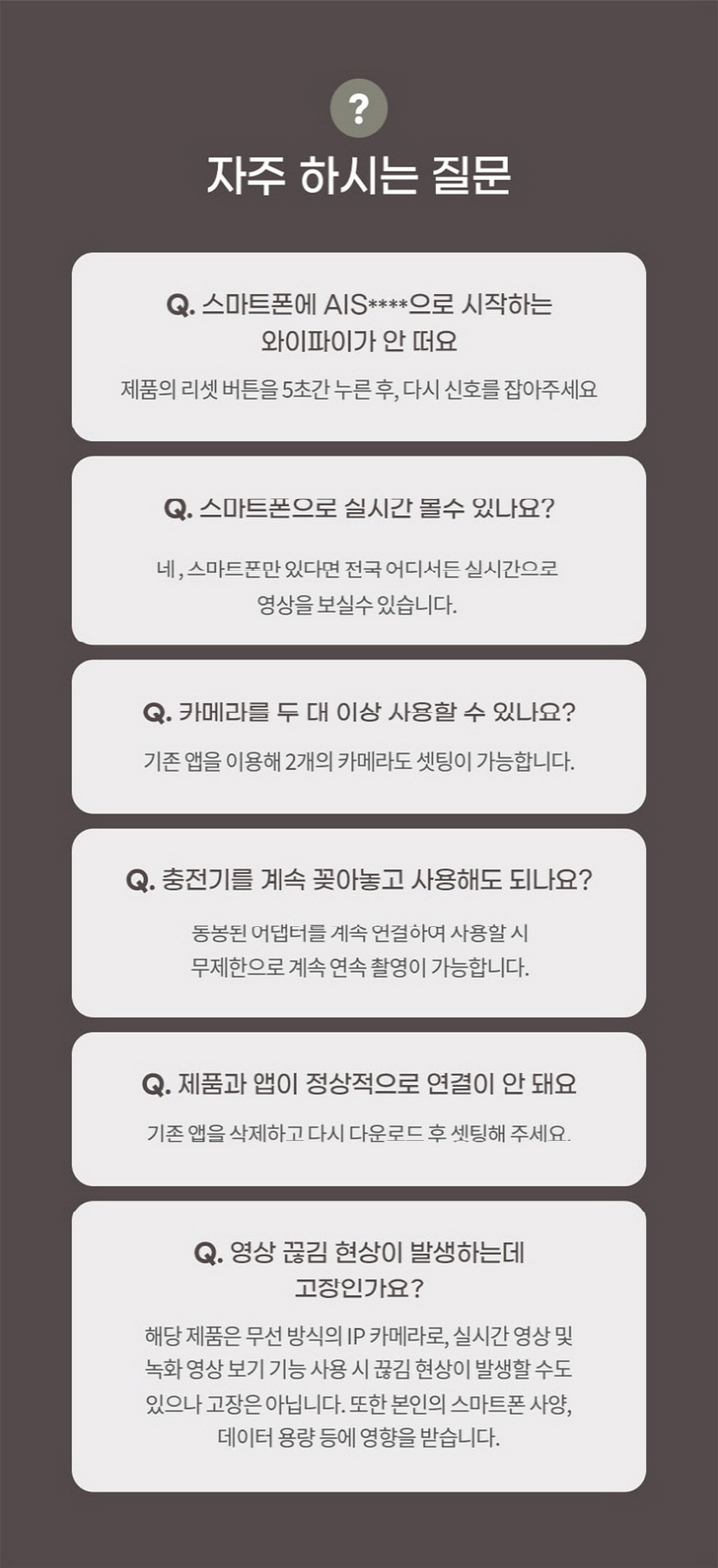 - 영상 끊김 현상 : 무선 특성상 네트워크 환경에 따라 발생할 수 있지만 고장은 아닙니다.