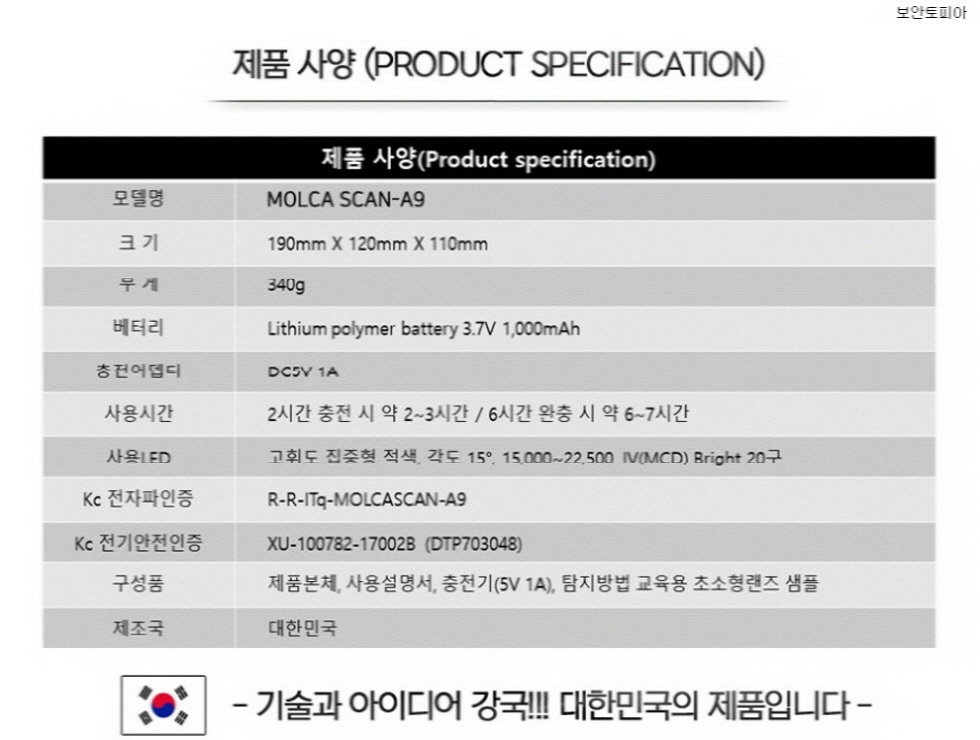 몰카스캔A9은 "Made in Korea"로 믿을 수 있는 품질을 자랑하며, 국내 기술력으로 설계된 유무선 초소형 몰카 광역 탐지기입니다.