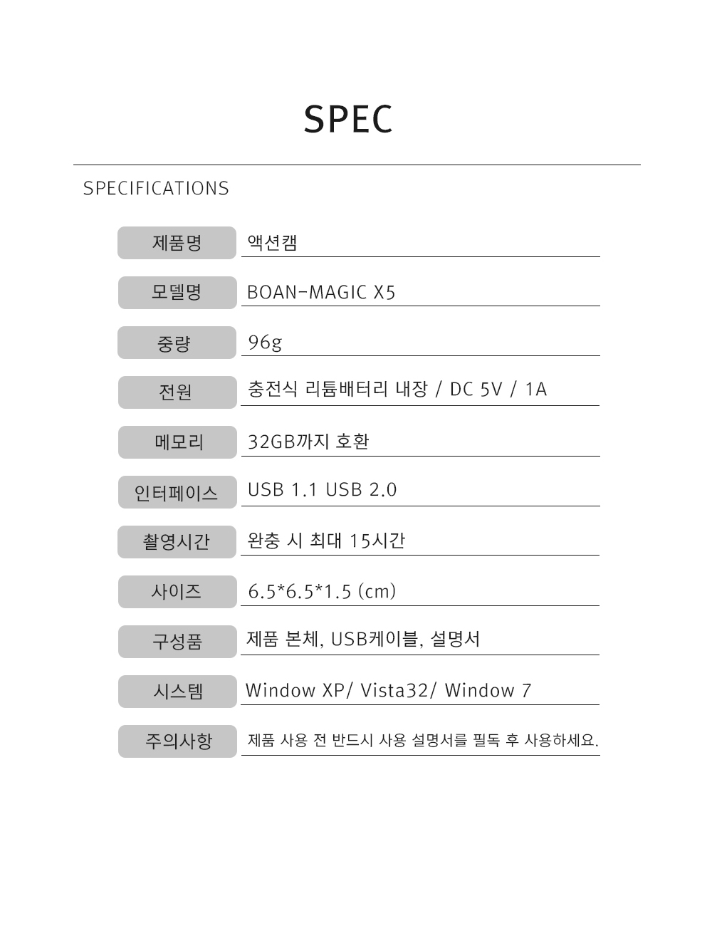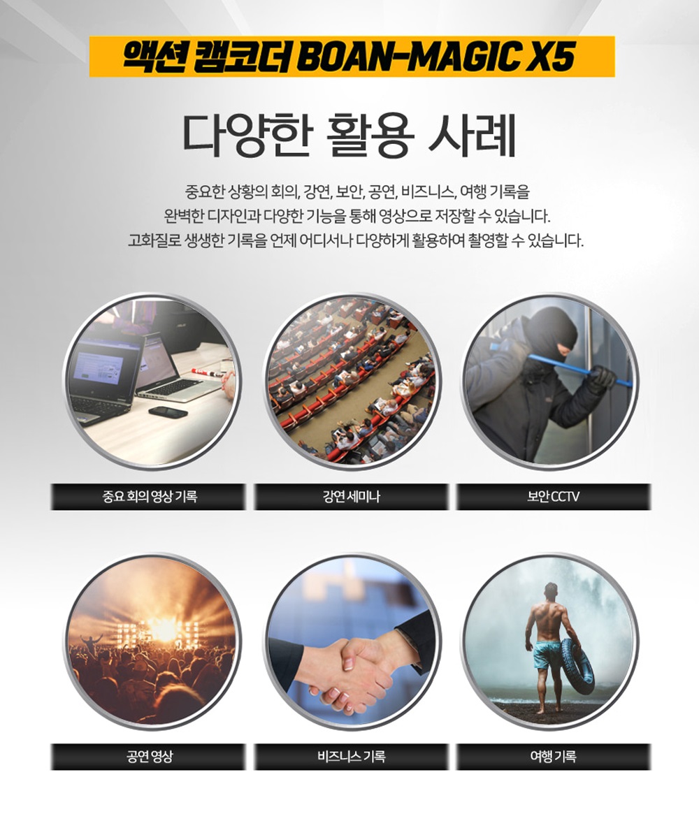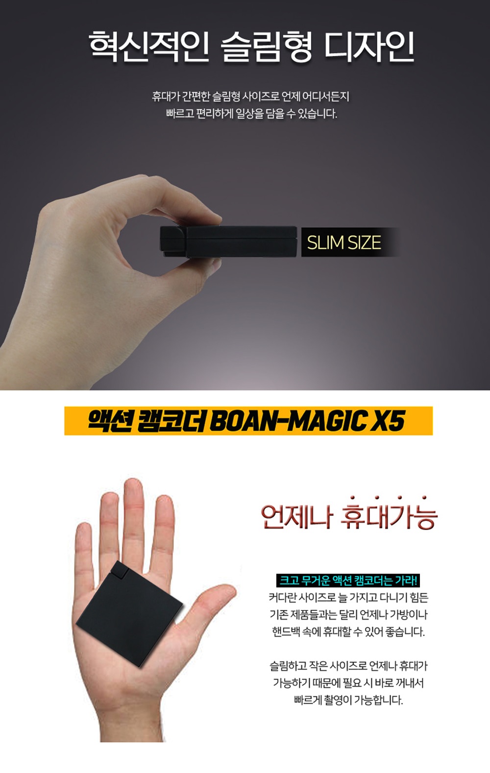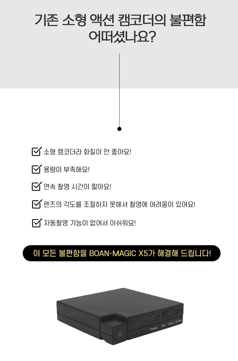 BOAN-MAGIC X5는 기존 액션캠의 짧은 촬영 시간, 제한적인 각도, 낮은 화질 등 주요 문제를 모두 개선했습니다.