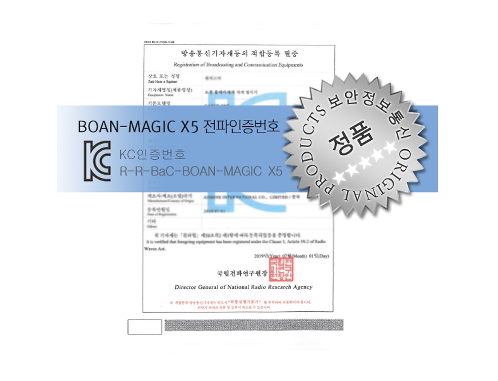 BOAN-MAGIC X5는 KC 인증을 받은 제품으로, 국내외에서 안전하게 사용할 수 있습니다.