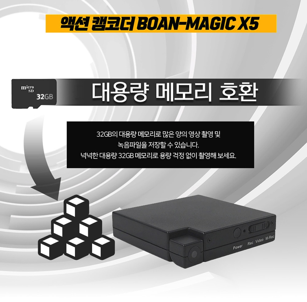 BOAN-MAGIC X5 는 90도 회전 가능한 렌즈와 오버라이트 기능을 갖춘 초소형 감시카메라입니다.