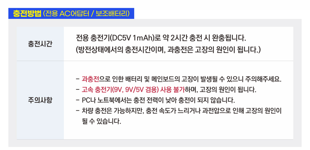 고속 충전기(9V 이상) 사용을 피하고, 과전압이 발생하지 않도록 주의해야 합니다.