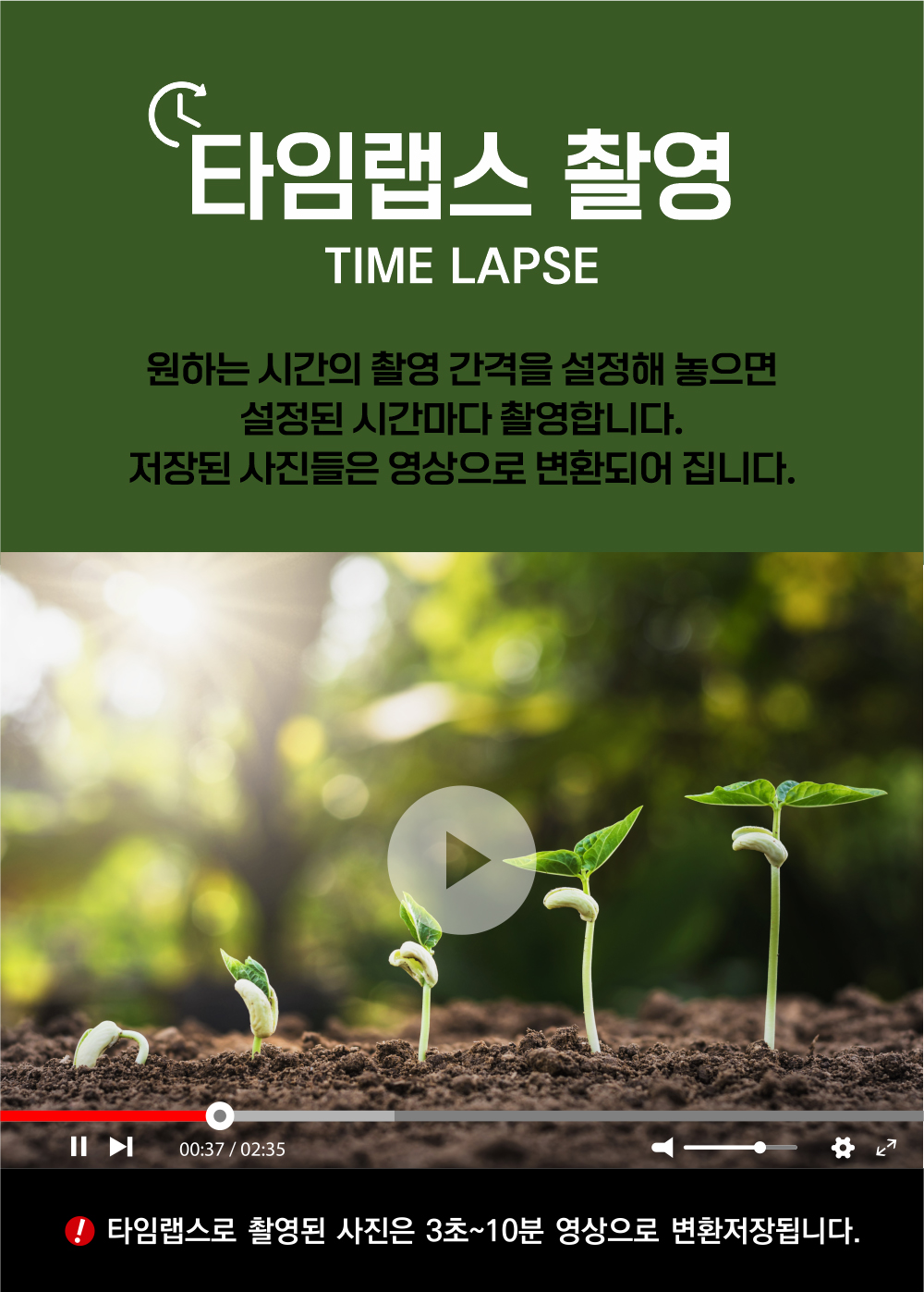 - 타임랩스 촬영 기능 지원 : 장기 프로젝트 감시 및 변화 기록 가능