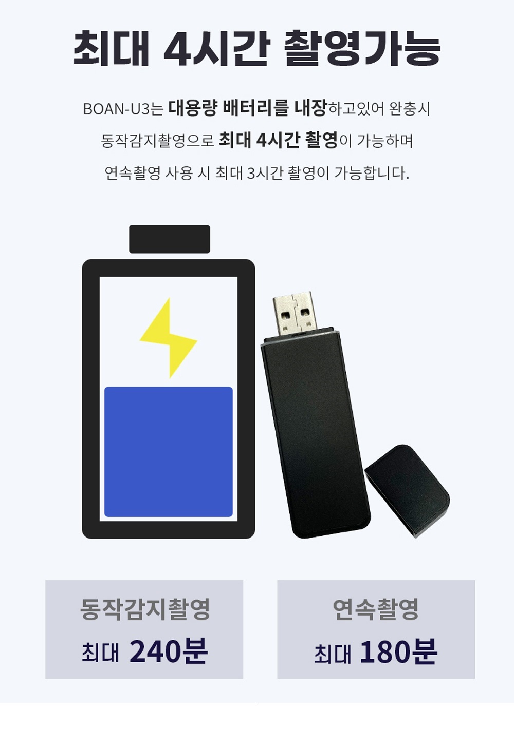 일반 USB 메모리처럼 보이는 디자인 덕분에 자연스럽게 사용할 수 있으며, 특정 환경에서 감시나 증거 수집이 필요한 경우에도 효과적으로 활용할 수 있습니다.