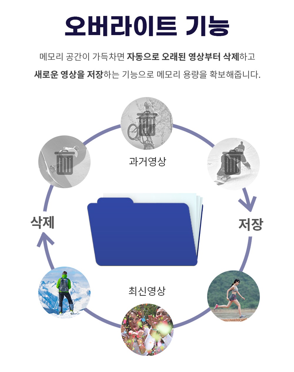 오버라이트 기능이 적용되어 메모리 공간이 가득 차더라도 오래된 영상이 자동으로 삭제되고 새로운 영상이 저장됩니다.