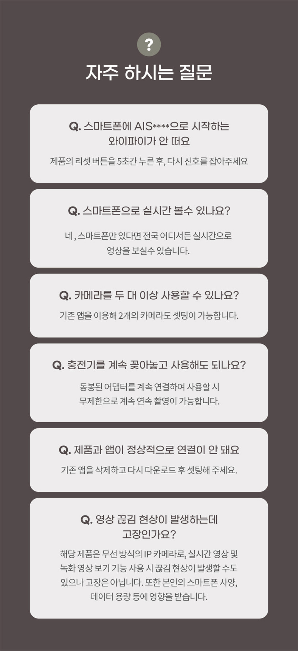 - Wi-Fi 연결 문제 : 리셋 버튼을 5초간 눌러 신호를 다시 잡아주세요.
