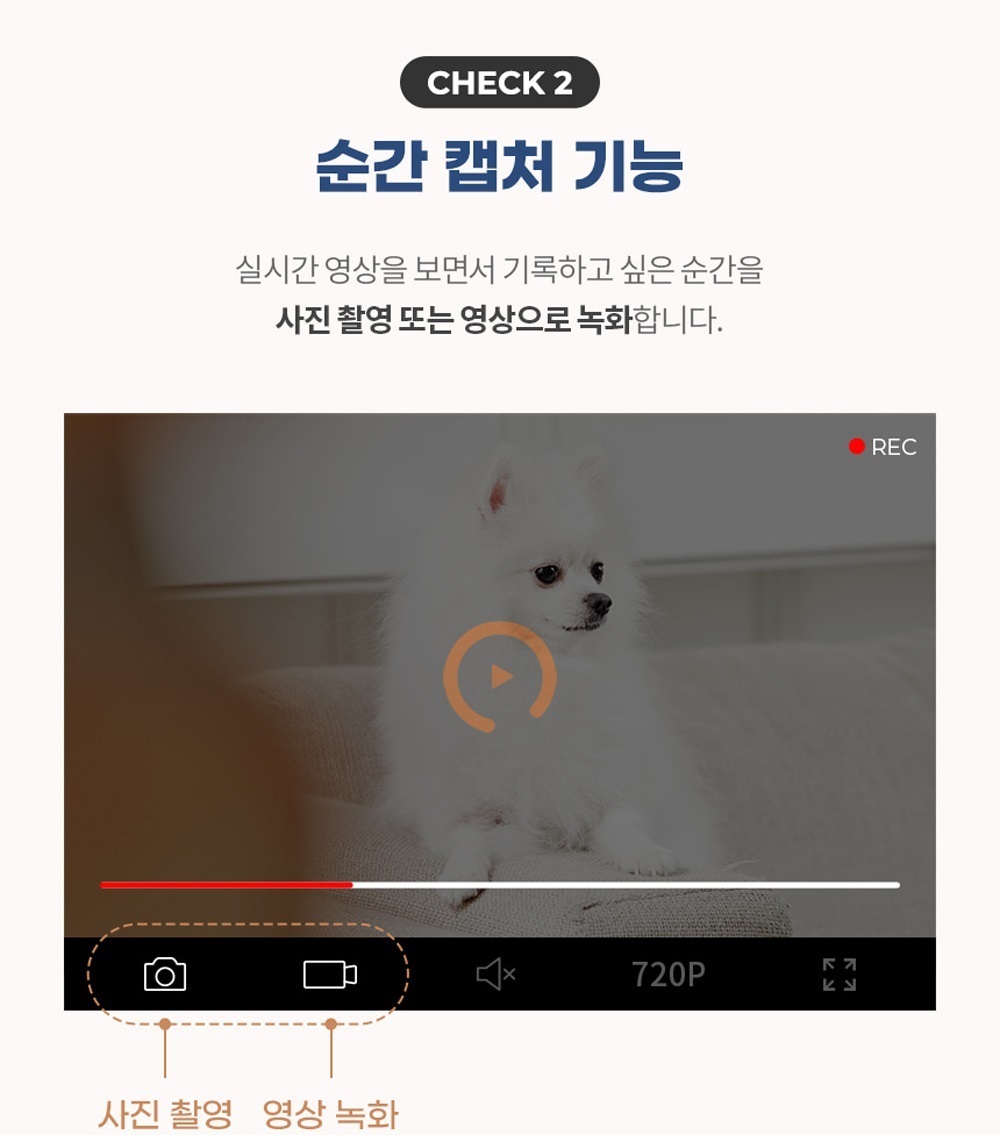 - 실시간 영상 확인 : 현재 촬영 중인 장면을 언제 어디서든 실시간으로 감상.