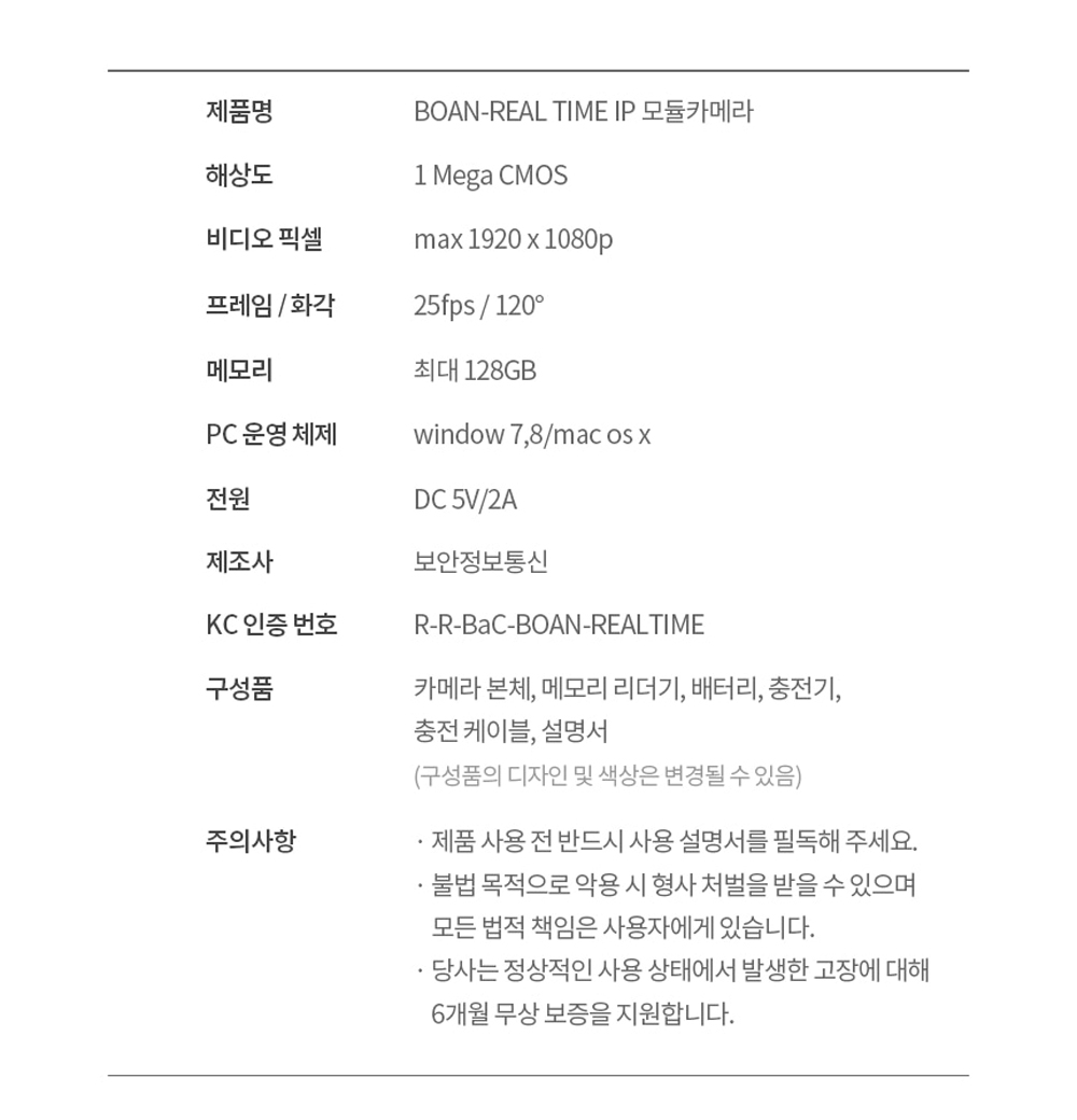 BOAN-REAL TIME IP 모듈 카메라는 국내 KC 인증을 받은 제품으로, 안전하고 신뢰할 수 있는 품질을 보장합니다.
