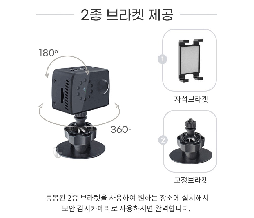 카메라는 180도 회전, 브라켓은 360도 회전이 가능해 원하는 각도로 자유롭게 조정할 수 있습니다.