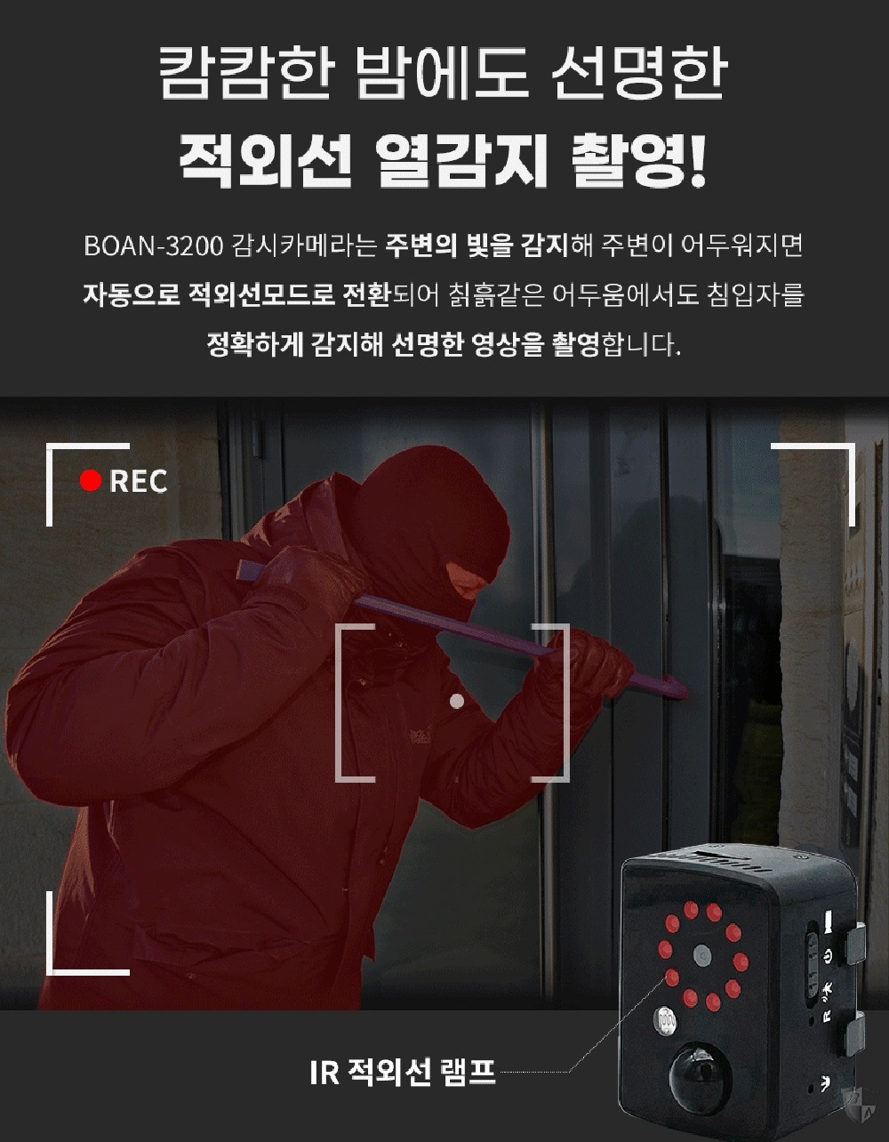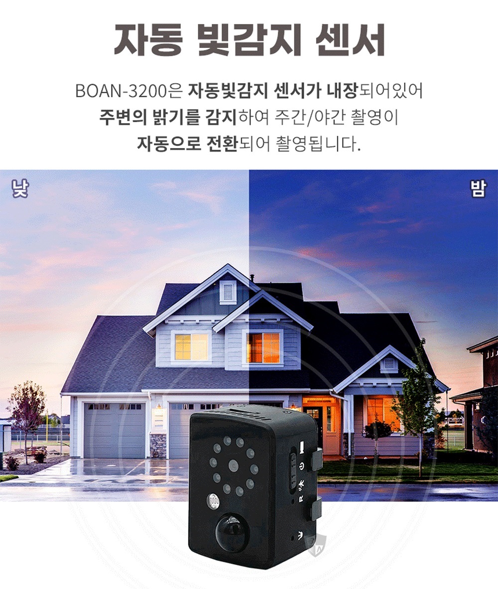 밤이 되면 BOAN-3200은 자동으로 적외선 열감지 카메라 모드로 전환되어 빛이 없는 공간에서도 선명한 영상을 제공합니다.