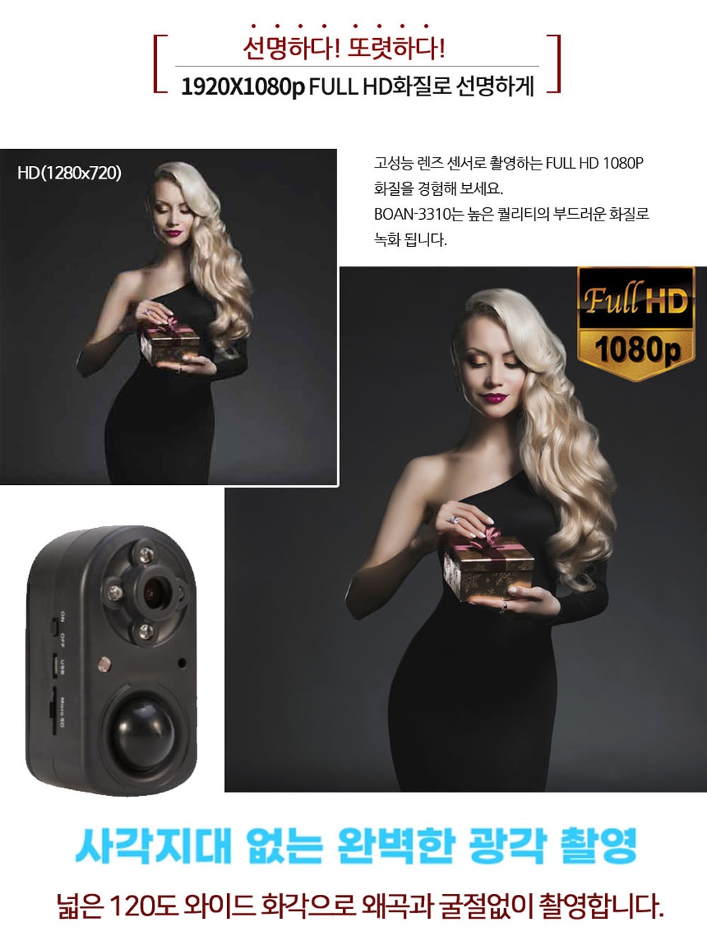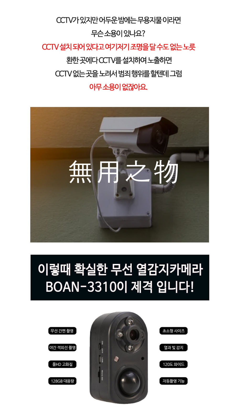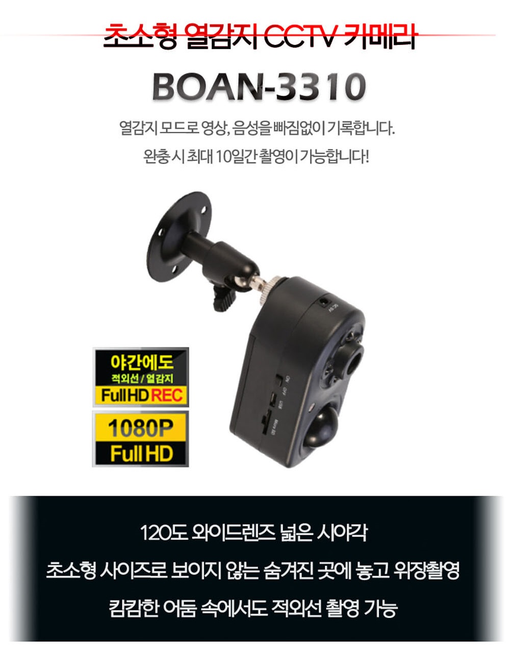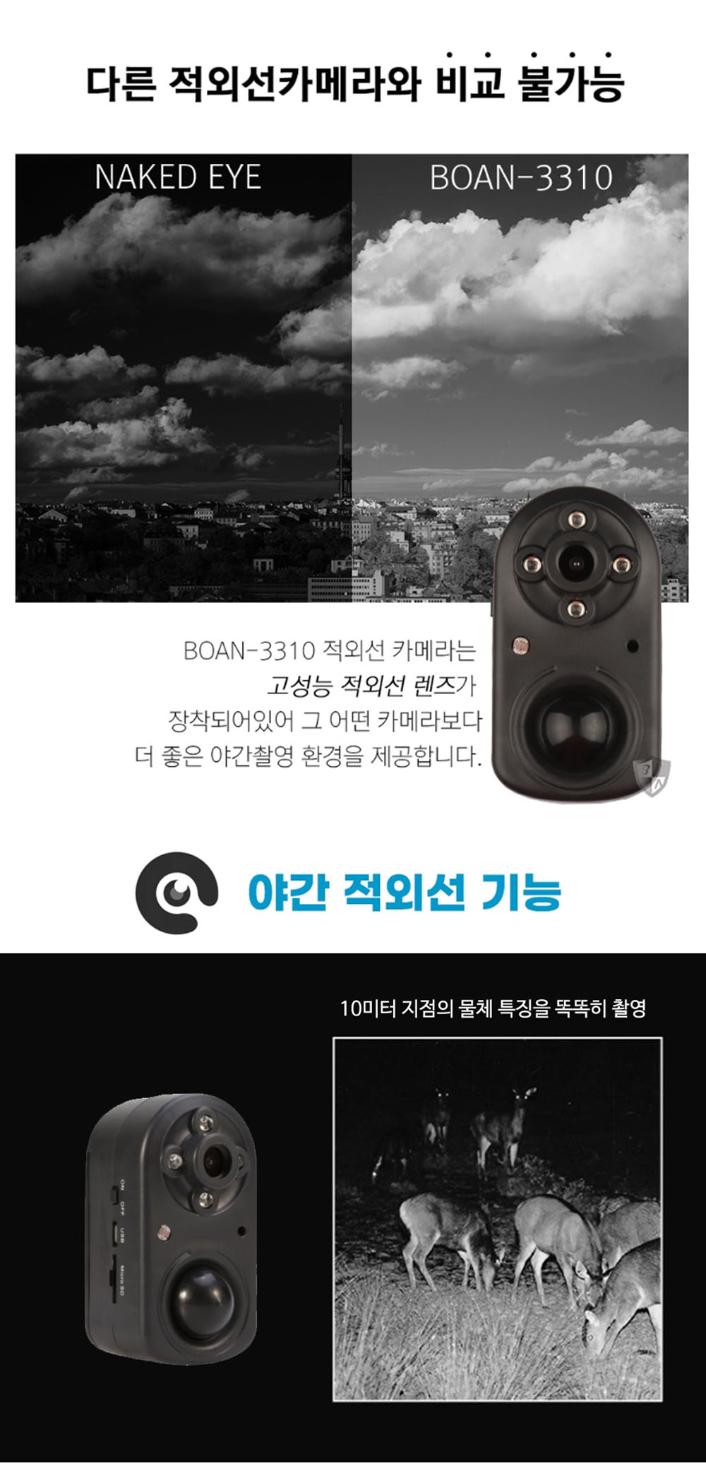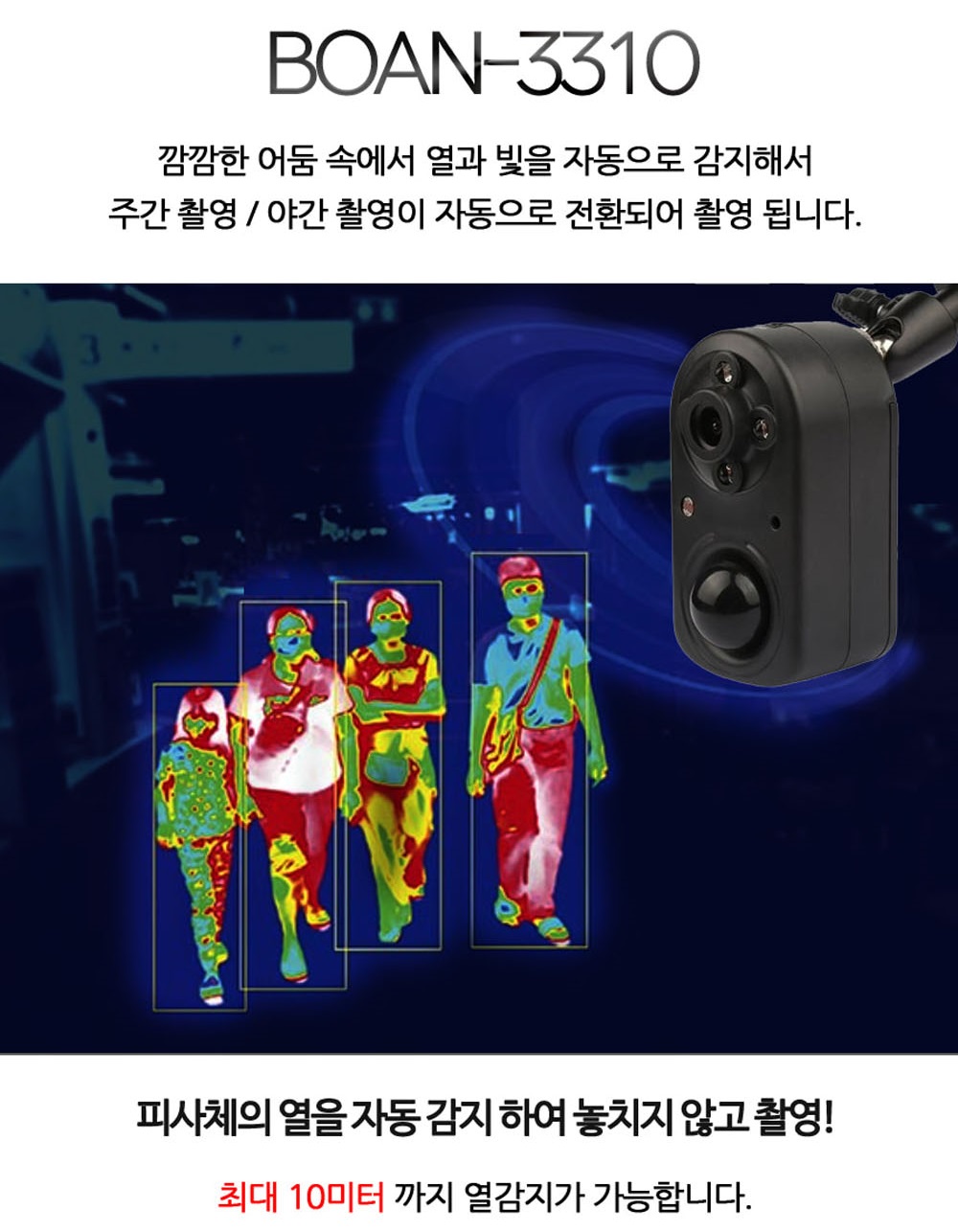 128GB지원카메라 BOAN-3310은 대용량 저장, Full HD 화질, 야간 적외선, PIR 센서까지 모두 갖춘 스마트 보안 장치입니다.