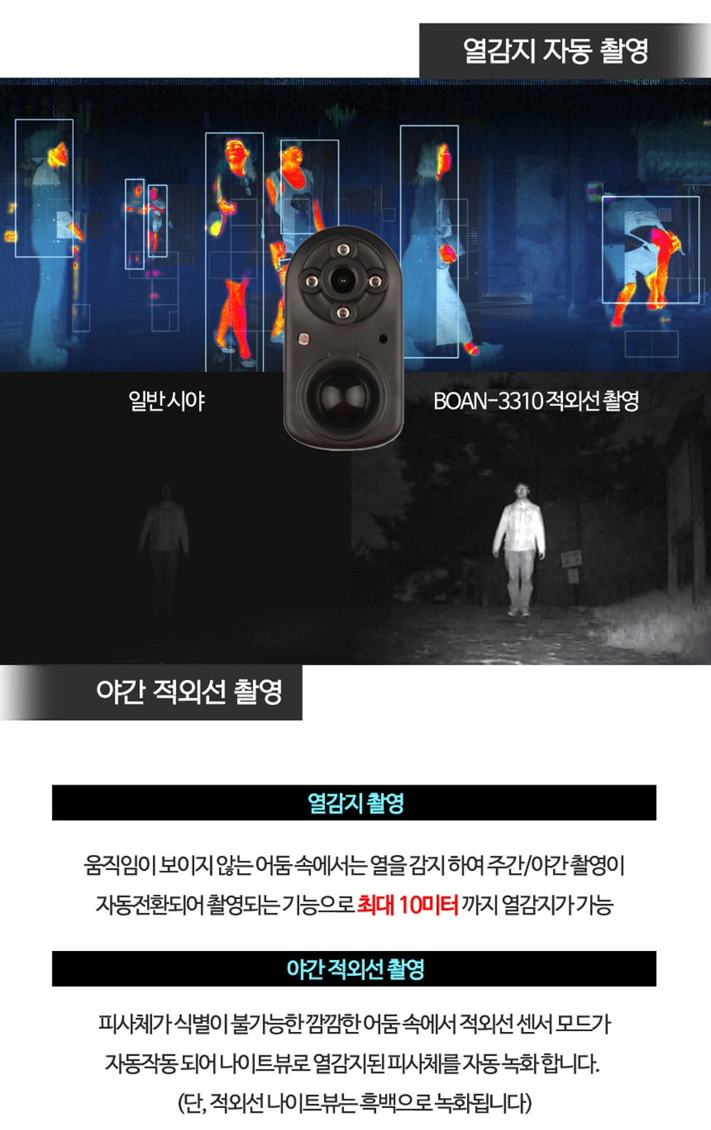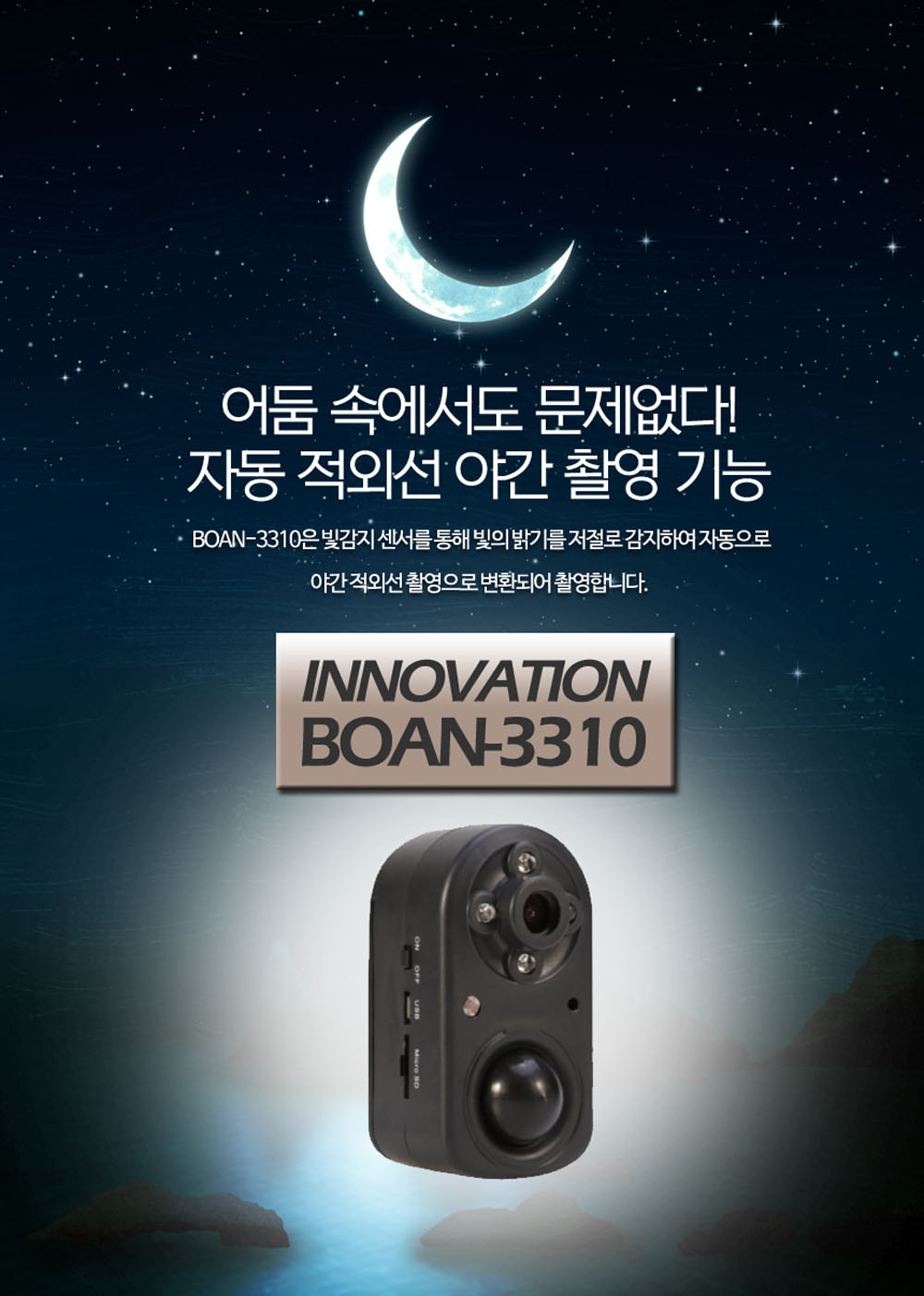 BOAN-3310은 야간감시카메라 기능으로 어둠 속에서도 뚜렷한 영상을 제공합니다.