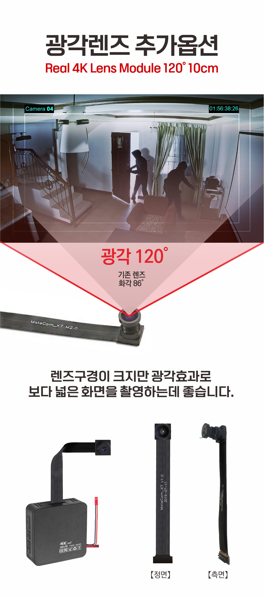 소형무선카메라는 모듈형 초소형캠으로 시야각은 86도이지만 추가옵션을 통하여 광각을120도까지 확장가능합니다.